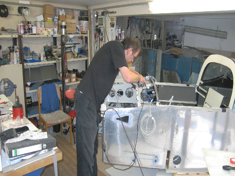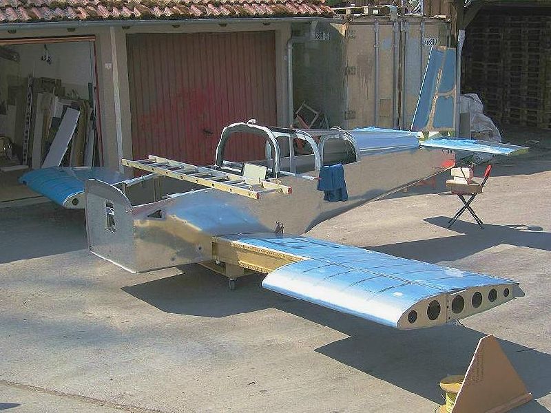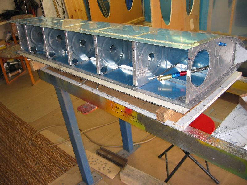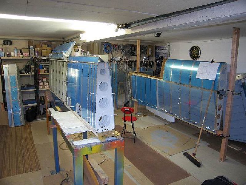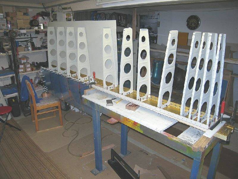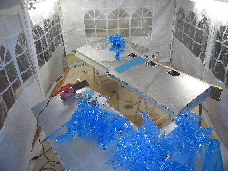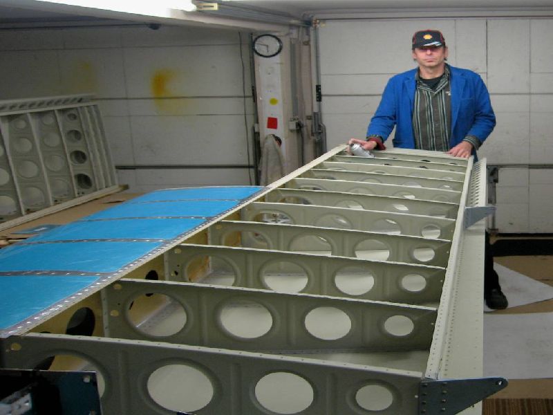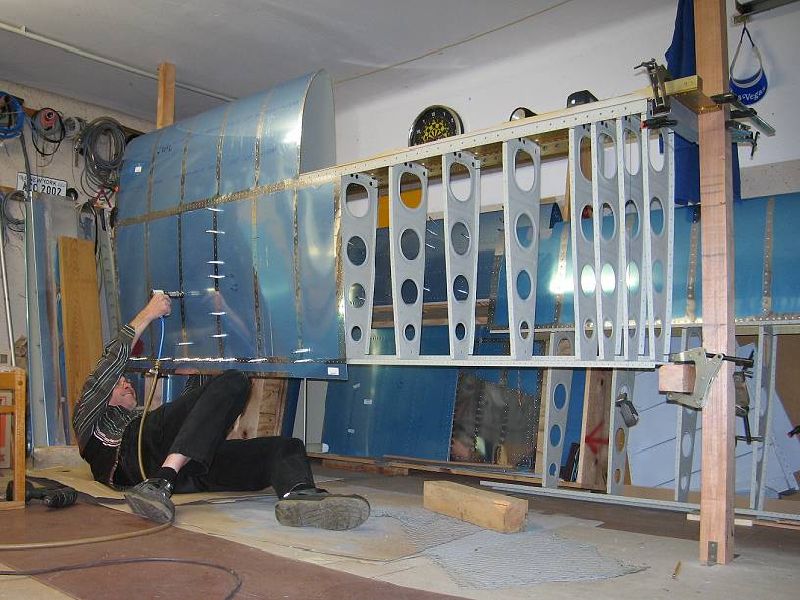 Anschleifen der Aluteile, Dimpeln, Primern und Nieten, danach noch offene Tragflächenhälfte: